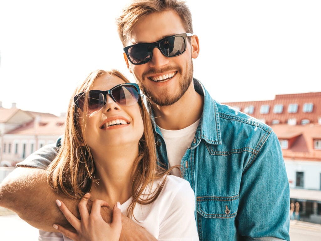 Coppia sorridente con occhiali di qualità all'aperto; lei davanti, lui l'abb...